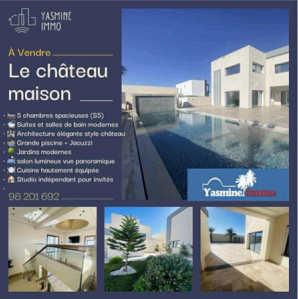 Description Villa S+4 indépendante avec piscine privée , située à Midoun – , dans un cadre calme et agréable. Parfaitement équipée pour un séjour confortable et reposant. Caractéristiques , Djerba 4 chambres suites (chacune avec sa propre salle d’eau) 1 salle d’eau extérieure supplémentaire (idéale pour la piscine ou les invités) Piscine privée dégagée - Salon spacieux, cuisine équipée -Jardin, terrasse, espace extérieur aménagé Climatisation Infos & réservations : Équipement intérieur Climatisation ,Télévision par câble ,Chauffage ,Internet ,
